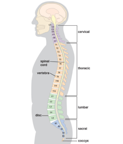 • The spinal column is one of the most important components of the human body and it forms the structure that allows us to stand, move, bend and twist. The spine also provides strong protection to our spinal cord that connects our brain to our nervous system.The human spine is generally consist of 33 vertebrae divided structurally into five regions such as 7 cervical vertebrae, 12 thoracic vertebrae, 5 lumbar vertebrae, 5 sacral vertebrae, and 4 coccyx vertebrae.